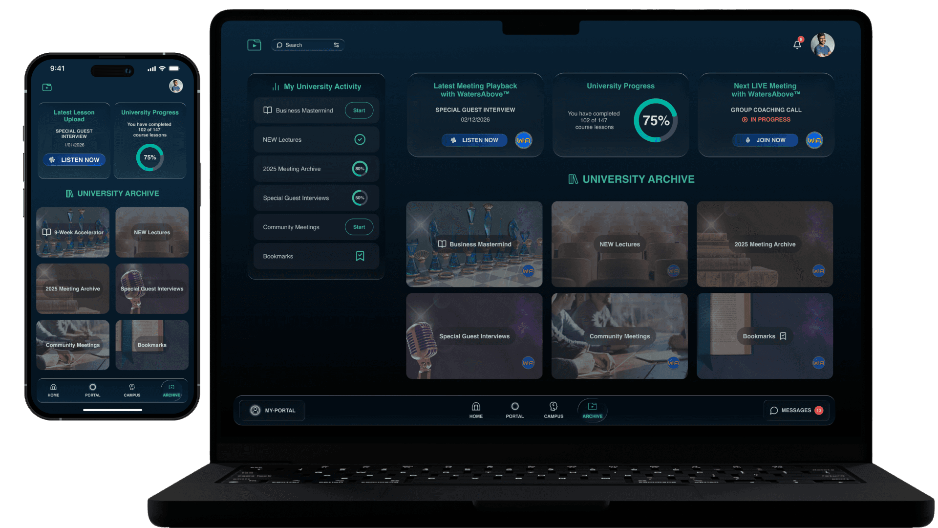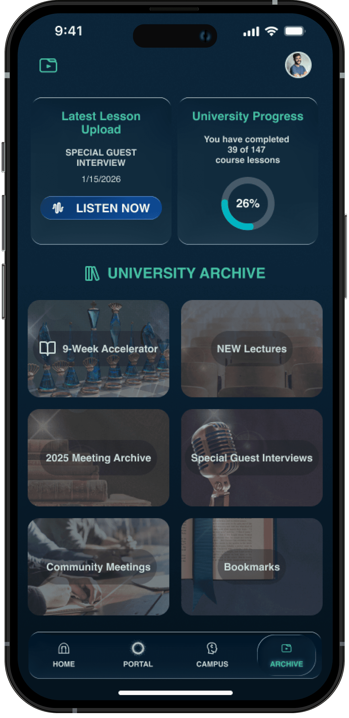 Easy access to your University Coursework, Meetings Playback, and Special Guest Interviews all-in-one place.